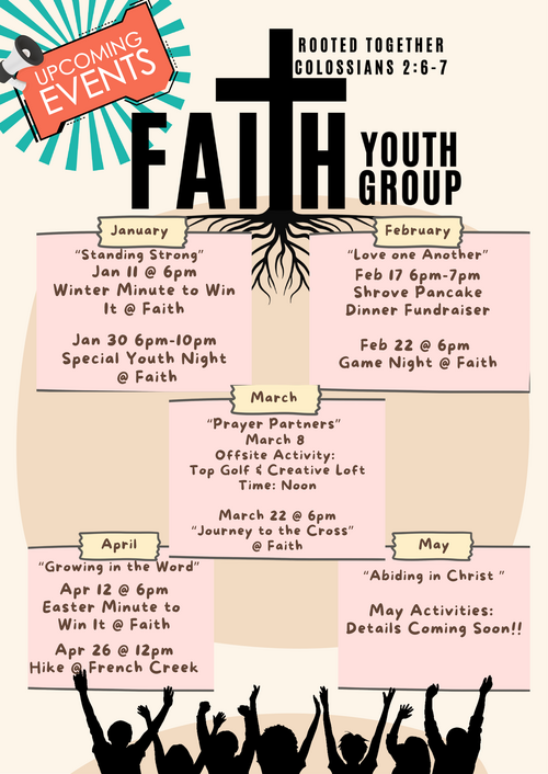 Faith's Youth Ministry includes Weekly Bible Study and bi-weekly youth nights for 6-12th grade students.